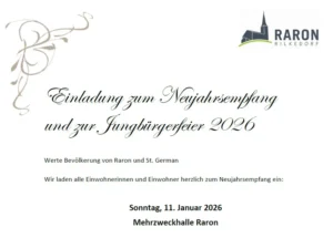 News Neujahrsempfang Raron Einladung zum Anlass am Sonntag, 11. Januar 2026, 17:00 Weiterlesen » 6. Januar 2026
