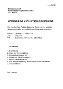 News Genossenschaft Rebbewässerung Rarnerkumme Einladung zur Generalversammlung 2026. Anhänge: Screenshot 2026-04-16 145513.jpg Weiterlesen » 16. April 2026