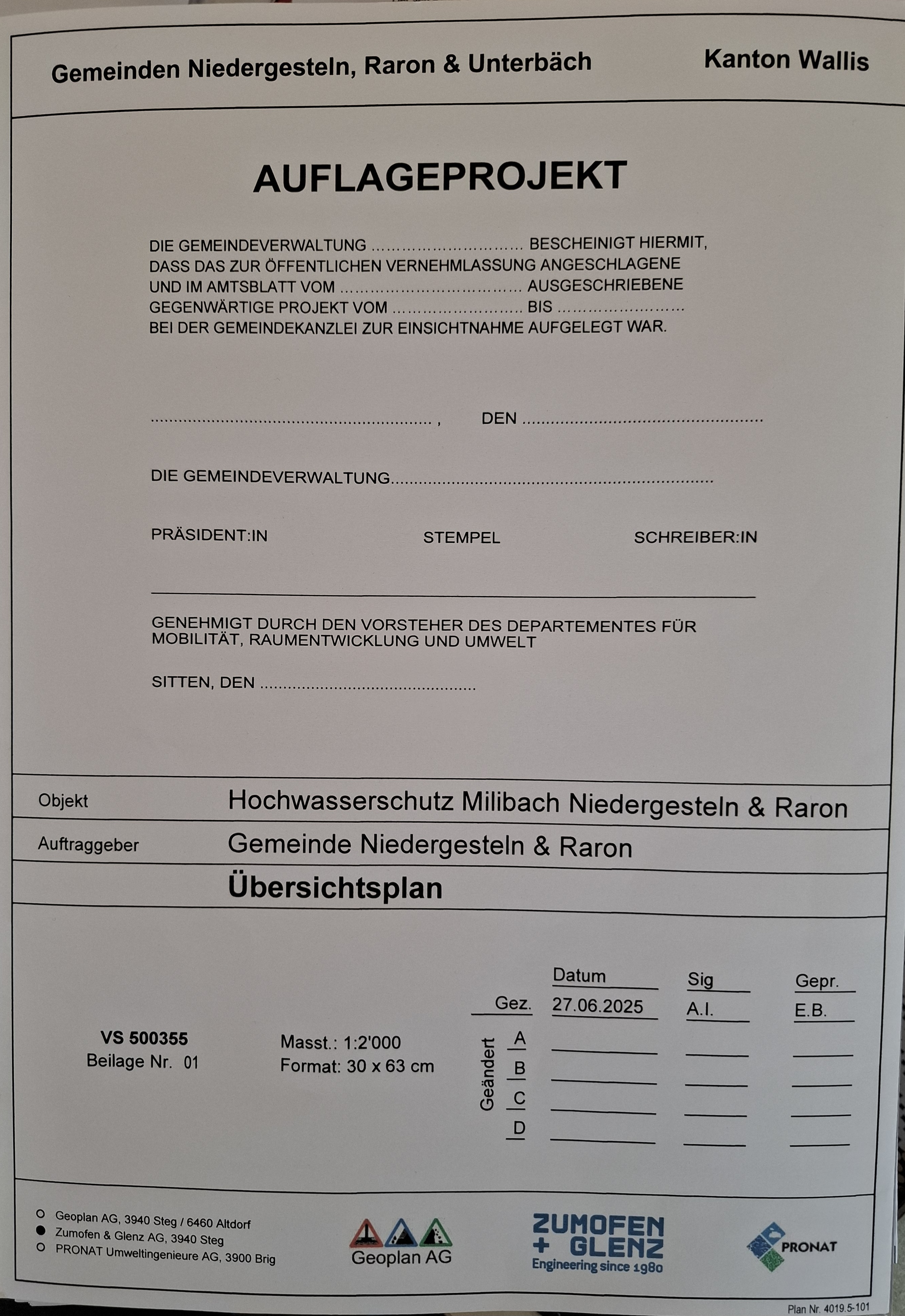 Die Gemeinden Niedergesteln, Raron und Unterbäch legen im Einverständnis mit der kantonalen Dienststelle Naturgefahren und nach erfolgter Vorprüfung durch die kantonalen Dienststellen das Auflageprojekt «HWS-Milibach», gelegen auf dem Gebiet der Gemeinde Niedergesteln und teilweise Unterbäch zur öffentlichen Einsichtnahme auf.