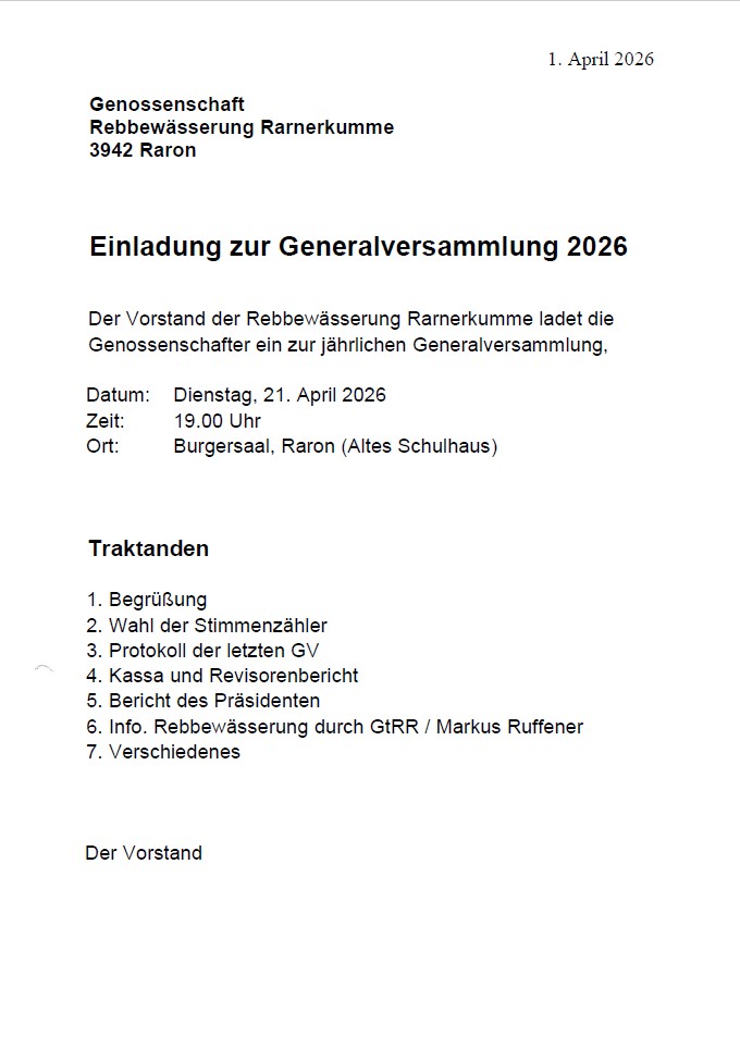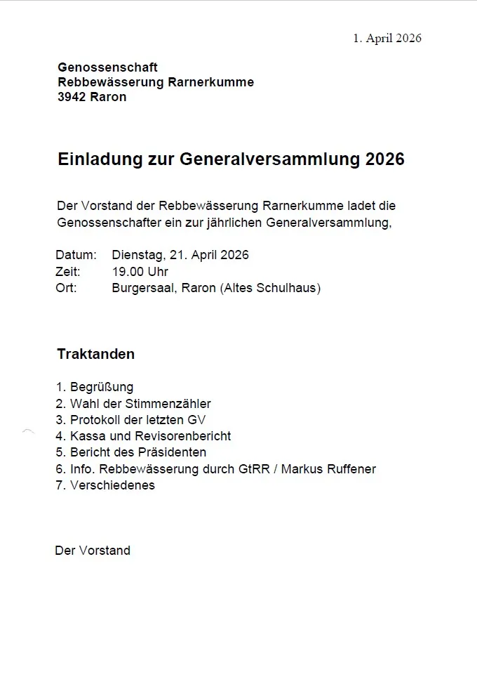Genossenschaft Rebbewässerung Rarnerkumme