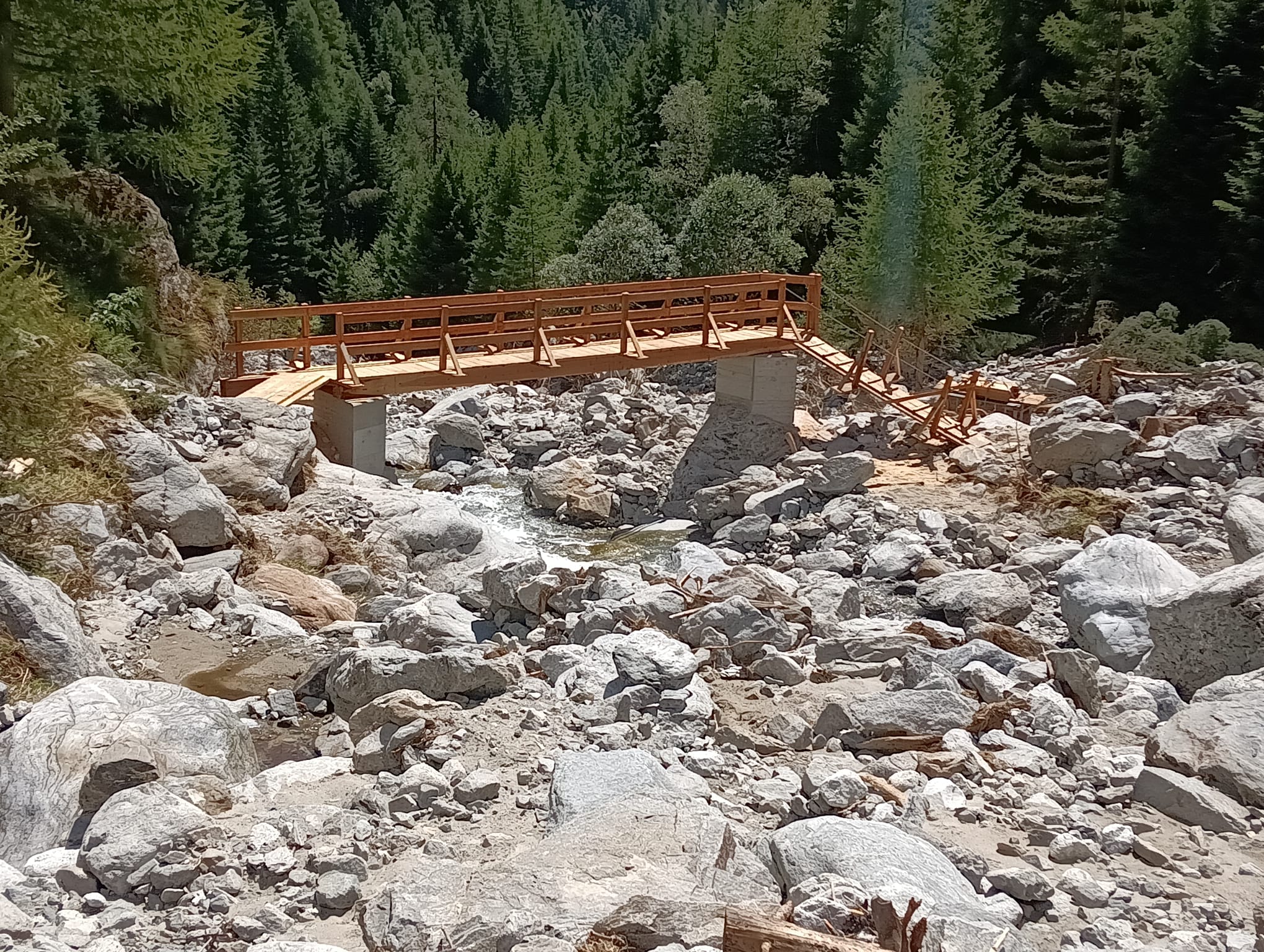 Beim Hochwasser vom 30.06.2025 wurde die Brücke hinter der Hütte im Bietschtal weggeschwemmt. Die Fundamente wurden um einen Meter erhöht und anschliessend eine neue Brücke montiert.Â